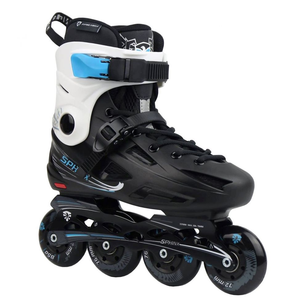 При созданий, роликов использовались такие материалы, как высококачественный пластик для ботинка и алюминиевый 6000 сплав для рам. Каф визуально максимально похоже как на роликах Powerslide Imperial и FR(ранее Seba) но немного выше выполнен в белом цвете с голубыми принтами. Ролики данной модели выполнены в черно-белом цвете с черными шнурками. Также данная модель доступна и в розовом цвете Flying Eagle F2s Sphinx Pink